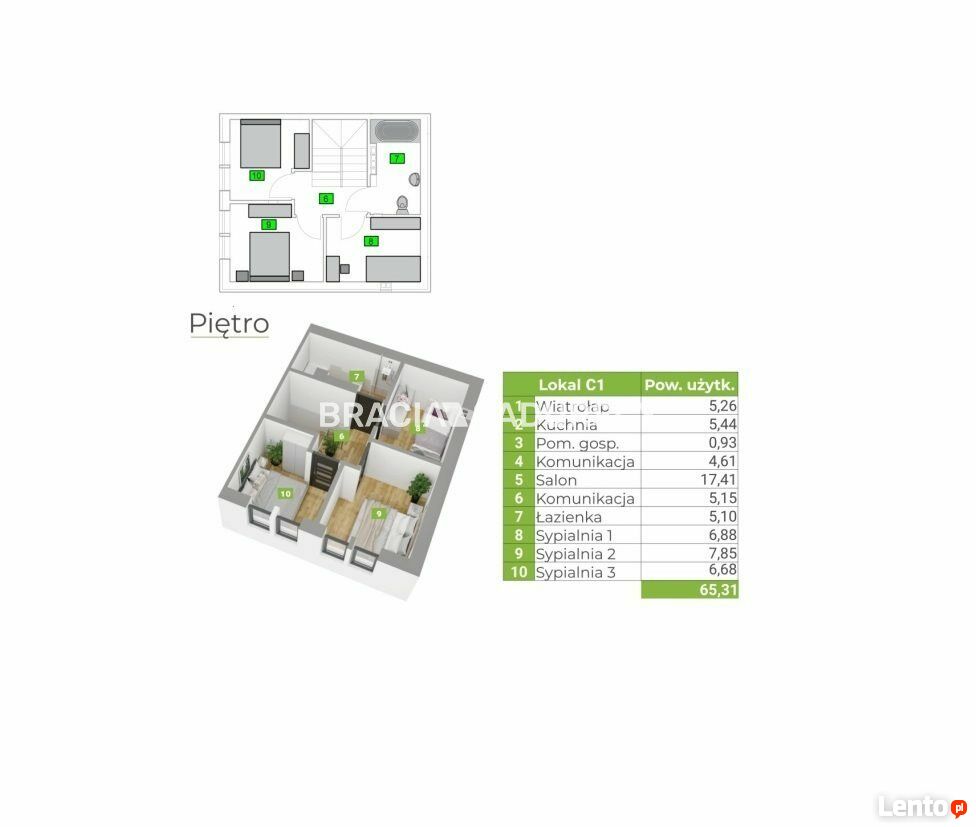 piętro z trzema niezależnymi sypialniami,